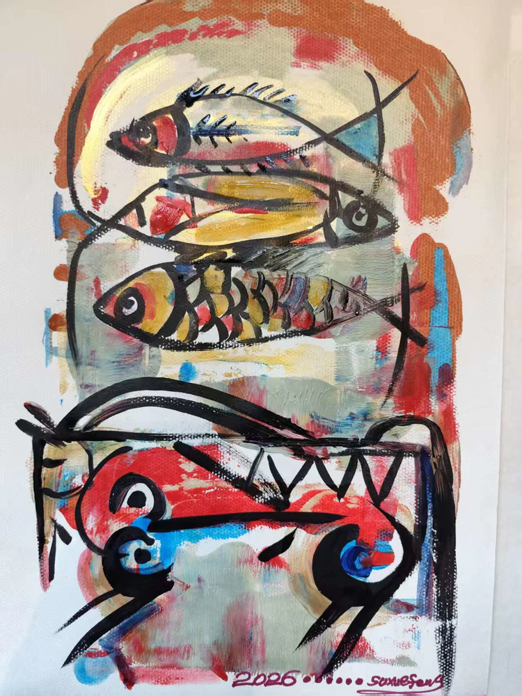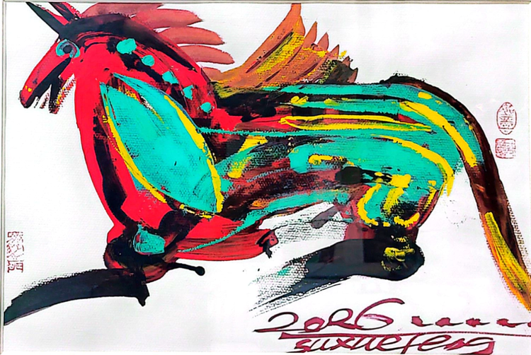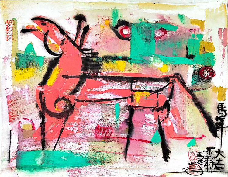 苏雪峰则以岩画为魂,在中西艺术的交融中开辟出独特的“岩彩光影”风格。他深耕贺兰山岩画的原始符号,将敦煌壁画“凹凸晕染”技法与印象派光影语言相融合,让古老文脉在当代创作中焕发新生。其《马既潇潇蹄》等作品,以岩彩的浓烈质感与线条的灵动韵律,勾勒出骏马的昂扬姿态,暗合“艺马当先”的展题深意;而融入甲骨文、传统图腾的创作,则在虚实相生间构建起“自然-人文-宇宙”的三维艺术场域,让新春的生机与文化的根脉相映成趣。